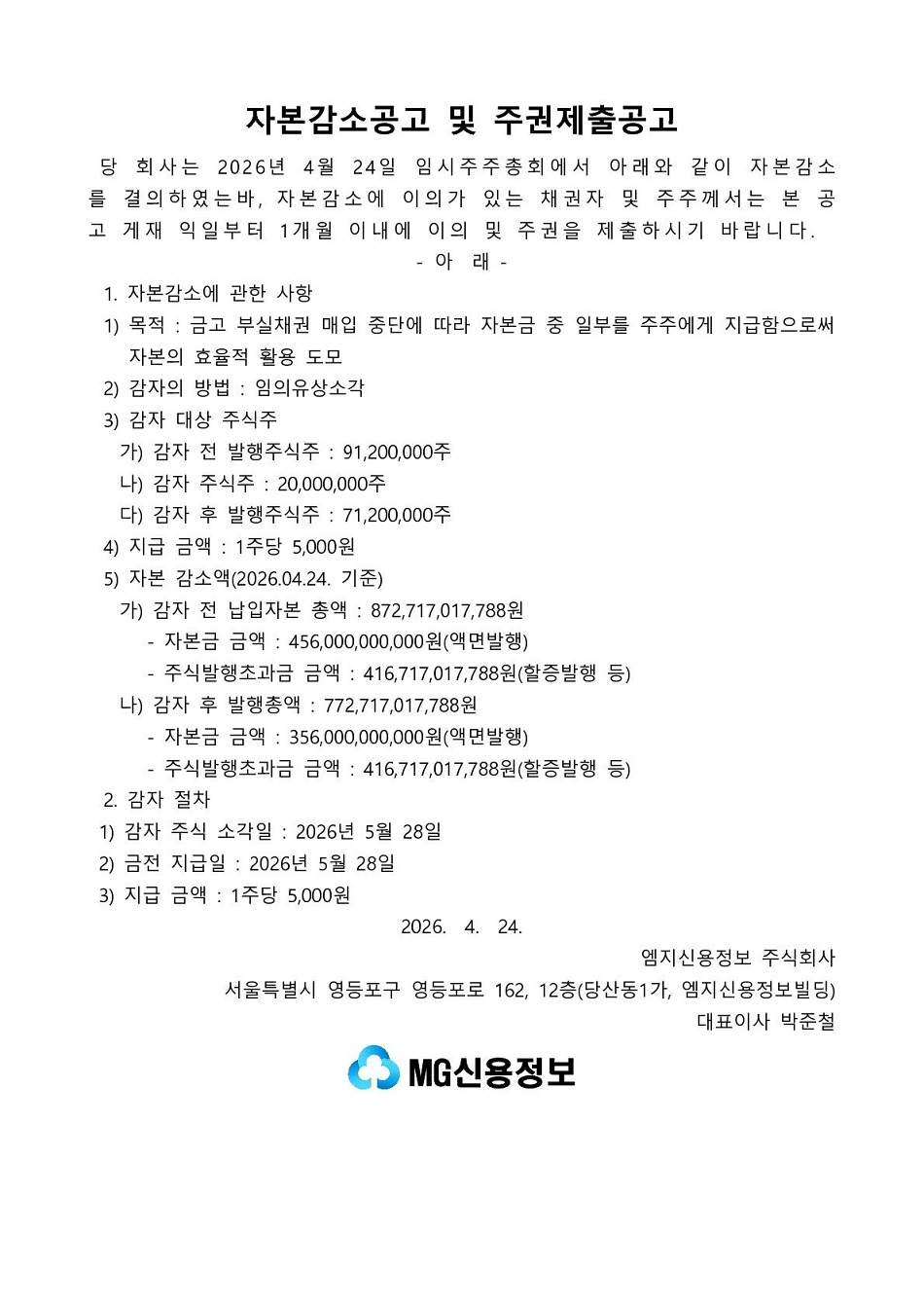 [공고]자본감소공고 및 주권제출공고(2026년 5월 유상감자의 건)