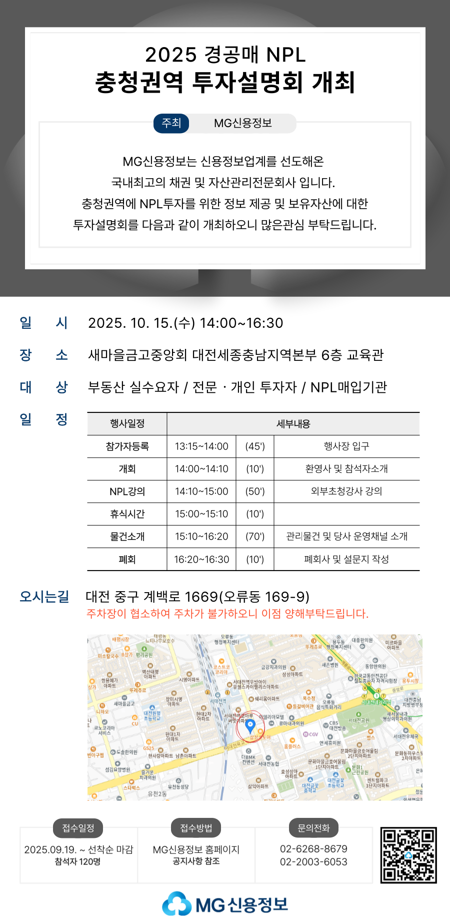 | 제목 | 충청권역 경공매NPL투자설명회(2025.10.15.) | 작성일 | 2025-09-19 10:58 |