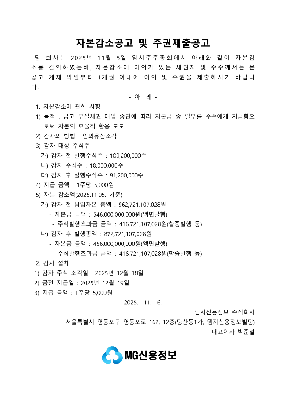 [공고]자본감소공고 및 주권제출공고(2025년 12월 유상감자의 건)
